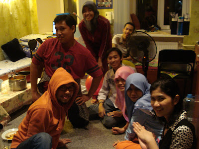 Kali ini Wanie yang jadi ketua masaknya. Orang Jawa. Jadi menunya ialah Mi Jawa. Saya belum pernah makan mi ini. Saya menyalin baju memakai baju memasak pagi tadi kerana kononnya hendak menolong Wanie di dapur. Yang lain pula menguruskan bahagian memasak masing-masing. Ada yang membuat donat coklat, kek, agar-agar santan, kek batik dan air. Sebelum hendak menjenguk ke dapur, saya singgah di bilik Diba. Kerana terlalu penat sejak petang semalam, saya tertidur di atas lantai di sebelah katil Wanie ketika sedang melihat mereka menguli doh donat. Sungguh. Saya sangat penat. Yang saya sedar hanyalah ketika Fatt menghulurkan bantal untuk saya dan saya hanya menjawab thank you. Kemudian terlelap semula. Tapi lelap saya tidak lama. Setengah jam lebih saja. Kemudian saya bangun dan saya mengambil tugas mengemas rumah. Dari dalam bilik, tandas, ruang tamu tempat kasut dan termasuklah menggilap cermin besar di ruang tengah itu. Kemudian saya mandi dan bersiap-siap kerana tetamu akan mula datang pada pukul 10 pm. Saya hanya memakai semula baju kurung ketika di embassy pagi tadi walaupun yang lain berkemeja dan blaus. Tetamu yang hadir semuanya tinggal di hostel ini juga.